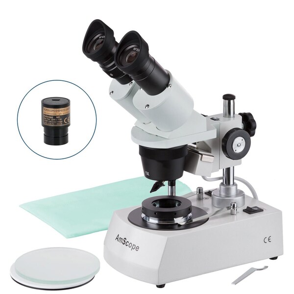 SE305 Series Compact Jeweler's Darkfield Binocular Stereo Microscope 10X-45X Magnification on Metal Pillar Stand with Angled Head, Top and Bottom Halogen Lighting and 1MP Digital Eyepiece. This binocular stereo microscope is designed mainly for jewelers, and comes with a darkfield stage-plate for viewing inclusions, and a gem clamp for holding gems and other objects to be viewed. It also features two pairs of stereo objective lenses mounted in a rotating nosecone, a sturdy all-metal pillar stand, and a versatile illumination system that provides both incident top lighting and transmitted bottom lighting. You can choose between incident illumination shining down onto the object or transmitted illumination through the frosted stage plate. The first is used for the observation of three-dimensional objects and the second for the observation of slides. This microscope offers high resolution and good depth within a broad field of view. It gives sharp clear stereo images. Its 45 degree inclined binocular head ensures an easy observation and rubber eye-guards provide further comfort. This model has a forward-oriented head which places the observation stage closer to the user which is typically beneficial for delicate work using soldering or cutting instruments. The ocular tubes can be easily adjusted to properly align with your eyes, and one is equipped with a diopter to compensate for astigmatism. Two pairs of objective lenses provide 10X, 15X, 30X, and 45X stereo magnification when used with the included 10X and 15X eyepieces. This range is intended for common soldering and mechanical repair, and inspecting larger objects. The objective magnification can be changed by simply rotating the nosecone to switch lenses. The viewing head uses 30.5mm ocular tubes to provide an extra-large field-of-view. One ocular tube has an integrated dioptric adjuster for users with astigmatism, or to fine-tune focus when using a camera in place of the eyepiece. The head can be adjusted for any user using rotating binocular adjustment to guarantee proper alignment with the eyes. Various eyepieces are available to expand the magnification range. This microscope is useful for many applications. It can be used in gemology, geology, forestry, archaeology, agriculture, biology and is appropriate for educational purposes in hospitals and schools. It is great for the exploration of the world of surface details and fine structures of various materials like wood, metal, solder, semicondu