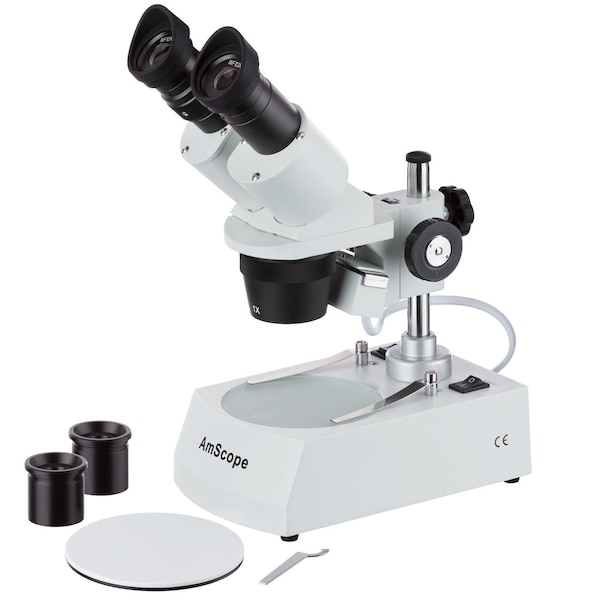 SE305 Series Compact Multi-Lens Binocular Stereo Microscope 10X-45X Magnification with Angled Head, Metal Pillar Stand, Top & Bottom Halogen Lighting. This stereo microscope offers 10X, 15X, 30X & 45X magnifications. It comes with a pillar stand, built-in incident and transmitted lighting systems. It is an ideal microscope for students to learn science. It is a perfect instrument for viewing insects, plants, rocks, stamps, coins, jewel and so on. It is an ideal family microscope. Features : 45 Degree Inclined Binocular Head with Locked-in Eyepieces Four Magnification Settings: 10X, 15X, 30X & 45X Sharp Stereo Erect Images over a Wide Field View Metal Body Construction with Arm Stand High Quality Original True Color Unbeatable Low Price Ocular-Tube with Adjustable Diopter Accurate Alignment Ensuring a Fatigue-Free Long Hour Viewing Full Optical Glass Elements Precise Ground Glass Lens All Metal Mechanical Components Adjustable Interpupillary Distance Built-in Incident top and Transmitted bottom Illumination System GS & CE Approval Electric Apparatus Extra Bulb, White/Black Base Plate and Rubber Eyeguards Included Manufactured under ISO 9001 Quality Control Standard Excellent Specifications : Head: 45 degree inclined binocular Widefield Eyepieces: WF10X & WF15X Objectives: 1X & 3X Diopter Adjustment: +/-5dp Interpupillary Distance: 2-3/16" - 2-15/16"55-75mm Working Distance: 2-1/8" 53mm Frosted Glass Objective Plate: 3-3/4" 95mm in diameter White/Black Plastic Objective Plate: 3-3/4" 95mm in diameter Illumination: AC 120V power supply, 12V/10W bulbs Accessories: a pair of eye-caps, a pair of clips and a dust cover Packing List : One Binocular Microscope w/ Forward Pillar Stand and Top & Bottom Lights One Pair of 10X Widefield Eyepieces One Pair of 15X Widefield Eyepieces One 3-3/4" 96mm Frosted Glass Plate One 3-3/4" 96mm Plastic Plate One Wrench for Focusing Tension Adjustment One Pair of Eye-guards One Pair of Clips One 12V/10W Spare Bulb One Dust Cover User's Manual Download Shipping Weight: 8 lbs For ages 10+