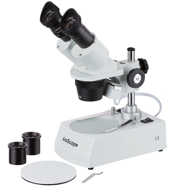 SE306 Series Compact Multi-Lens Binocular Stereo Microscope 20X-60X Magnification with Angled Head, Metal Pillar Stand, Top & Bottom Halogen Lighting. This binocular pillar-stand stereo microscope offers four magnification powers, 20X, 30X, 40X & 60X. It comes with a versatile illumination system that provides both incident top lighting and transmitted bottom illumination. You can choose between incident illumination shining down onto the object or transmitted illumination through the frosted stage plate. The first is used for the observation of three-dimensional objects and the second for the observation of slides. This microscope offers high resolution and good depth within a broad field of view. It gives sharp clear stereo images. Its 45 degree inclined binocular head ensures an easy observation and rubber eye-guards provide further comfort. This microscopy system is a great instrument for many applications. It can be used in geology, forestry, archaeology, agriculture and biology. It is appropriate for educational purposes in hospitals and schools. It is great for the exploration of the world of surface details and fine structures of various materials like wood, metal, solder, semiconductor and stone. It is perfect for the examination of insects, plants, rocks, stamps, coins, jewel, soldered points, microelectronic components or virtually any three dimensional objects. This scope is an ideal tool for watchmaker, jeweler, engraver, dies-maker, philatelist, coin collector, students, and etc. It comes with first-class quality and affordable price. Features : An affordable great stereo microscope 45 degree inclined binocular head with locked-in eyepieces Four magnification levels: 20X, 30X, 40X & 60X Sharp stereo erect images over a wide field view High quality original true color Unbeatable lowest price Ocular-tube with adjustable diopter Accurate alignment ensuring a fatigue-free long hour viewing Rugged metal frame and pillar-stand Full optical glass elements Precise ground glass lens All metal mechanical parts Adjustable interpupillary distance Built-in both incident and transmitted illumination Systems Upper/lower halogen lights GS & CE approval electric apparatus Extra bulb, white/black base plate and rubber eye-guards included Manufactured under ISO 9001 Quality Control Standard Excellent Specifications : Head: 45 degree inclined binocular Widefield Eyepiece: WF10X and WF15X Objective: 2X & 4X Diopter Adjustment: +/-5dp Interpupillary Distance: