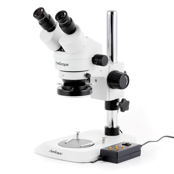 SM-1 Series Zoom Binocular Stereo Microscope 3.5X-45X Magnification with Multi-Zone 144 LED on Compact Pillar Stand. This is a binocular stereo zoom microscope with a compact stand with 12" pillar. The stand's base has an extended, beveled front edge for comfortable hand placement. The microscope incorporates all the most excellent features of a high quality laboratory instrument. Designed to meet the demands of modern microscopy applications, this microscope exceeds all expectations. It comes with SUPER widefield optics and basic table stand. This microscope offers high resolution and good depth within a broad field of view. It provides crystal clear sharp stereo images with a 4" 100mm native working distance. Its 45 degree inclined ocular tubes ensure an easy observation and rubber eyeguards provide further comfort. The stereo optics provide clear, sharp images with excellent focus-depth and a large working-distance. With 0.7X-4.5X zoom objectives, moving through the magnification range is as easy as turning a knob. 10X wide-field eyepieces provide an ample magnification range from 7X to 45X, with high-eyepoint optics to accommodate glasses or goggles. A 0.5X Barlow lens is included, which can be mounted to the objective housing to halve the magnification range to 3.5X-22.5X. This also increases the working distance. The combined magnification ranges provide 3.5X-45X. This microscope is useful for many applications. It can be used in gemology, geology, forestry, archaeology, agriculture and biology. It is appropriate for educational purposes in hospitals and schools. It is great for the exploration of the world of surface details and fine structures of various materials like wood, metal, solder, semiconductor and gemstone. It is perfect for the examination of insects, plants, rocks, stamps, coins, jewel, soldered points, microelectronic components, circuit boards or virtually any three dimensional objects. This scope is an ideal tool for research labs, gemologists, collectors, engravers, watchmakers, jewelers, dies-makers, philatelists, and anyone in semiconductor or electronic industry. This package includes a 144-LED ring-light with quadrant-control for bright and cool illumination. This lightweight illuminator mounts to the microscopes objective housing, and projects a smooth, encompassing field of light over objects, eliminating most shadows. When you need some shadows to bring out more details, the power-controller provides control over four s