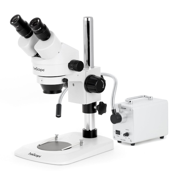 SM-1 Series Zoom Binocular Stereo Microscope 7X-45X Magnification with 30W LED Fiber Optic Single Gooseneck Light on Compact Pillar Stand. This is a binocular stereo zoom microscope with a compact stand with 12" pillar. The stand's base has an extended, beveled front edge for comfortable hand placement. The microscope incorporates all the most excellent features of a high quality laboratory instrument. Designed to meet the demands of modern microscopy applications, this microscope exceeds all expectations. It comes with SUPER widefield optics and basic table stand. This microscope offers high resolution and good depth within a broad field of view. It provides crystal clear sharp stereo images with a 4" 100mm native working distance. Its 45 degree inclined ocular tubes ensure an easy observation and rubber eyeguards provide further comfort. The stereo optics provide clear, sharp images with excellent focus-depth and a large working-distance. With 0.7X-4.5X zoom objectives, moving through the magnification range is as easy as turning a knob. 10X wide-field eyepieces provide an ample magnification range from 7X to 45X, with high-eyepoint optics to accommodate glasses or goggles. This microscope is useful for many applications. It can be used in gemology, geology, forestry, archaeology, agriculture and biology. It is appropriate for educational purposes in hospitals and schools. It is great for the exploration of the world of surface details and fine structures of various materials like wood, metal, solder, semiconductor and gemstone. It is perfect for the examination of insects, plants, rocks, stamps, coins, jewel, soldered points, microelectronic components, circuit boards or virtually any three dimensional objects. This scope is an ideal tool for research labs, gemologists, collectors, engravers, watchmakers, jewelers, dies-makers, philatelists, and anyone in semiconductor or electronic industry. This package includes a powerful 30W LED illuminator with a fiber-optic gooseneck. The energy-efficient light-source projects bright, daylight-balanced light which is channeled through a 22" gooseneck fiber-optic light-guide. This allows you to project light from virtually any angle, targeting specific details of the object being viewed. The flexible, heavy-duty metal-sheathed guides will hold up to heavy use in your workshop, factory, or lab without worry of crimping or breaking. The light-source is equipped with an active cooling system which is much quiete