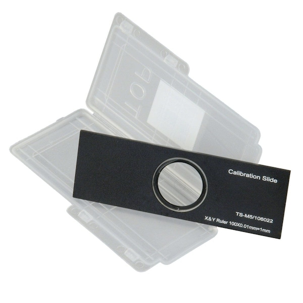 X-Y 0.01mm Aluminum Microscope Calibration Slide. Features: Scales on high quality Schott optical glass disk Durable aluminum slide, long life time than all-glass slide Glass disk does not contact stage, ensure no scratch on the scales Specifications: Model: A36CALM5 Slide material: Aluminum, scales on Schott optical glass X Scale: 1mm/100 division, 0.01mm per division Y Scale: 1mm/100 division, 0.01mm per division Slide size: 76mm x 25mm x 1.5mm Packing List: X-Y 0.01mm calibration slide stage micrometer with plastic case