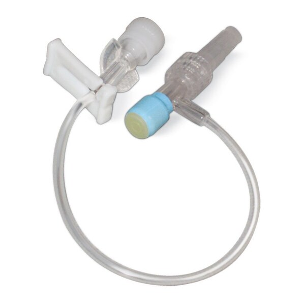 Distal end has a female luer fitting. Proximal end has male luer lock with latex injection port. Also slide clamp for control. Sterile. 6-7'' length.
