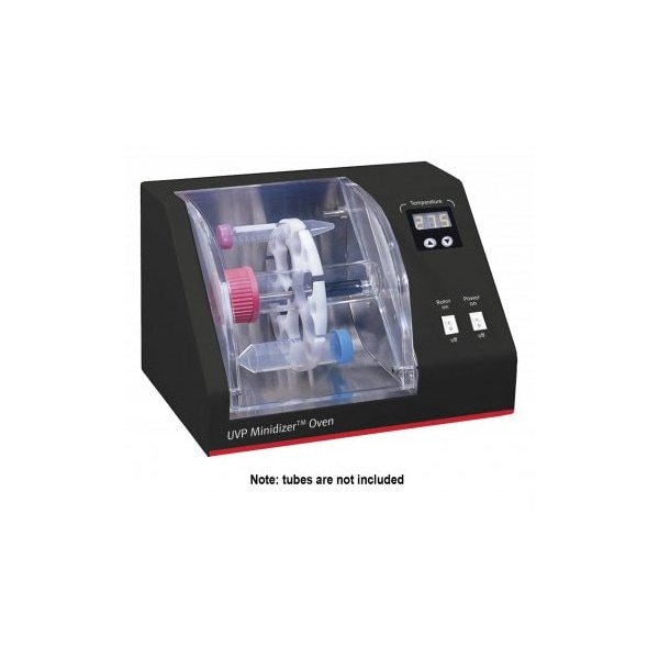Compact size is excellent for limited bench space. Rotation speed is set at 12 rpm with precision temperature controls. Has a bottle capacity of four 35 x 150mm bottles, four 50 ml and eight 15 ml conical plastic bottles. Minidizer has consistent, repeatable results achieved with microprocessor controls. The chamber interior is stainless steel fabrication with a 3/8 inch beta blocking acrylic cover. Cover swings down for easy access to the bottle carousel. Carousel pops out of chamber for easy insertion or removal of bottles.