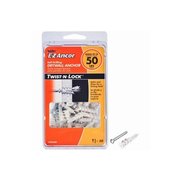 E-Z Ancor Twist-N-Lock 50 #6 x 1-1/4 in. Flat-Head Philips Medium-Duty Self-Drilling Drywall Anchors 50-Pack are for indoor drywall applications. Great for installing bathroom accessories, blinds or curtains, picture frames, mirrors, smoke detectors and more. No pre-drilling necessary - screw directly into drywall.Use for indoor drywall applications in 1/2 in. or 5/8 in. drywallGreat for installing bathroom accessories, blinds, picture frames, smoke detectors and moreWeight on package 50 lbs. is the maximum project load in 1/2 in. drywall50 lbs. weight capacity is for items hung flush to wall and may be less for those hung out from wall, like shelvingNo need to pre-drill - screw directly into drywallDo not overtighten anchorAudible click lets you know when the anchor is firmly setInstalls flush against the wall to prevent items from wobblingSplits and grips for a strong hold that won't back outMade with high-strength fiber-reinforced resin for superior durabilityCreates a small hole for easy installation, cleanup and removalDo not use for ceiling applicationsDo not use for mounting televisions