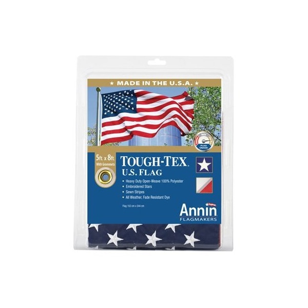 5' x 8', Tough Tex US Flag, 100 2 Ply, Spun Woven, Polyester Fabric Resists High Winds, Open Weave Reduces Fabric Stress For Longer Wear, Sewn Stripes Embroidered Stars, The Longest Lasting Flag Made, 1 Year Colorfast, ClamShell