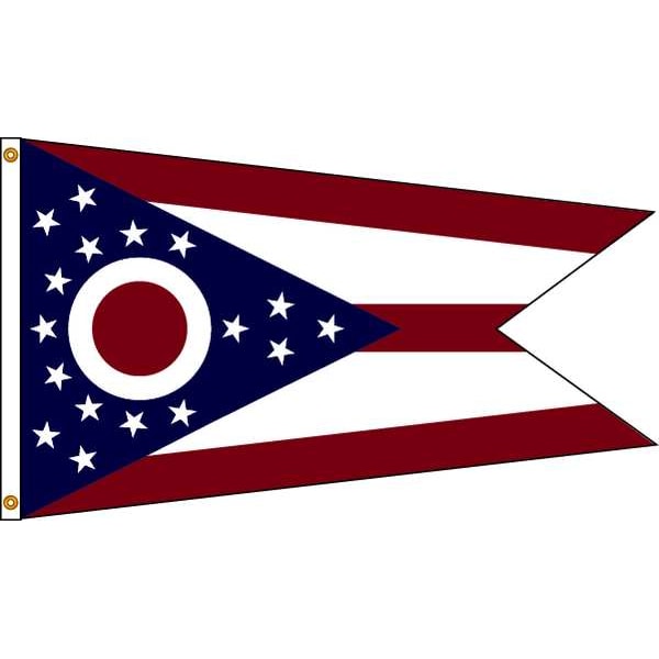 State Flag, Ohio, Indoor/Outdoor, Style Screen Printed, Single/Reverse Image, Header and Grommets, Flag Height 5 ft., Flag Width 8 ft., Min. Flagpole H 30 Ft., Material 200 Denier Nylon, For Use With Flag Staff or Flag Pole