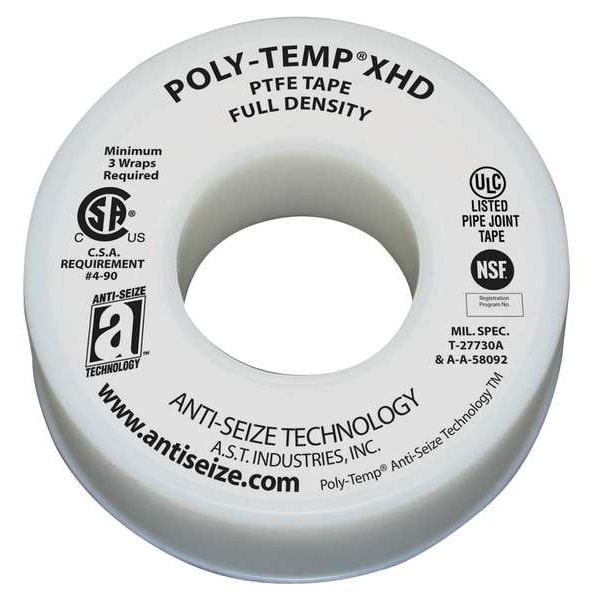 Thread Sealant Tape, Specific Sealing Application General Purpose Thread Sealing, Series POLY-TEMP(R) XHD, Overall Width 1 1/2 in, Overall Length 43 ft, Minimum Operating Temperature -400 Degrees F, Maximum Operating Temperature 550 Degrees F, Maximum Operating Pressure for Liquids 10,000 psi, Maximum Operating Pressure for Gases 2,000 psi, Maximum Linear Density 1.5 g/cc, Minimum Linear Density 1.2 g/cc, Color White, Tape Type Pipe Thread Sealant Tape, For Maximum Thread Diameter 1 1/2 in