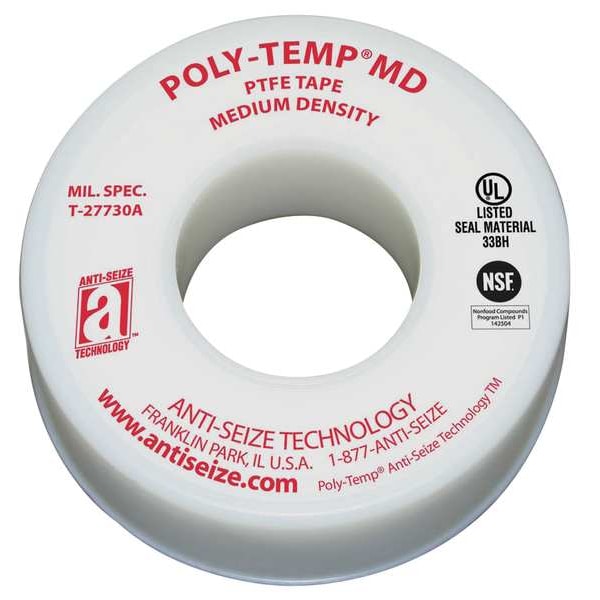 Thread Sealant Tape, Specific Sealing Application General Purpose Thread Sealing, Series POLY-TEMP(R) MD, Overall Width 1/4 in, Overall Length 43 ft, Minimum Operating Temperature -400 Degrees F, Maximum Operating Temperature 550 Degrees F, Maximum Operating Pressure for Liquids 10,000 psi, Maximum Operating Pressure for Gases 2,000 psi, Maximum Linear Density 0.8 g/cc, Minimum Linear Density 0.7 g/cc, Color White, Tape Type Pipe Thread Sealant Tape, For Maximum Thread Diameter 1 1/2 in