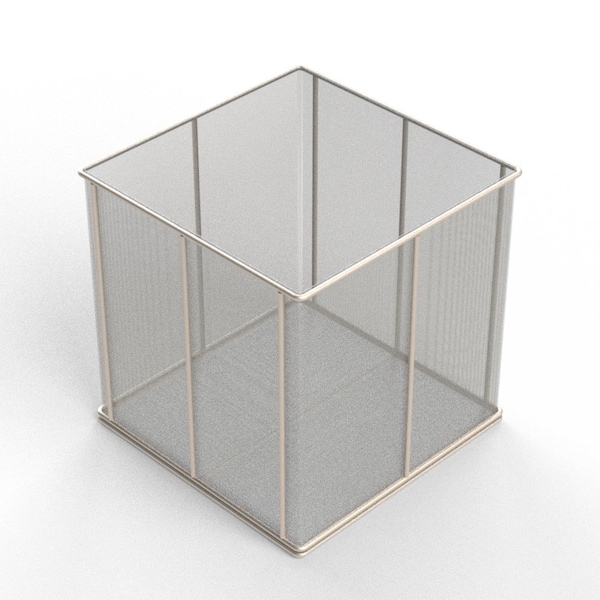 Rectangular Stainless Steel Wire Mesh Basket. For Ultrasonic Cleaning, Degreasing, Dipping and Cleaning Parts. 10L x 10W x 10H approx. outside dimensions excluding handles. 3/16 Dia. Rod Frame with all joints TIG welded for strength. No Handles, No Lid. Lined with 30 Mesh x .012 Woven Wire .021 Openings, 40% Open Area fully resistance welded into the frame and ground smooth. 304 Stainless Steel, Natural Finish. Reference Part #TMT-100100100-N30S . Est. wgt: 2.3 lbs. Capacity: 45 lbs.