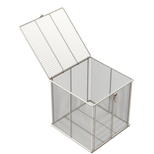 Rectangular Medium Duty Basket: 12in. L x 12in. W x 12in. H approx. outside dimensions of mesh lined area. Perfect for Parts Washing, Ultrasonic Cleaning, Vapor Degreasing, Sifting, Straining, and Material Handling. Strong 1/4in. Dia. Rod Frame with all joints TIG welded for strength, Hinged Lid with Compression Latch, No Handles. Lined with 2 Mesh x 0.063in. Welded Wire 2 wires per inch, 0.437in. Openings, 76% Open Area. Mesh fully resistance welded into the frame and ground smooth, . 304 Stainless Steel, Clean Natural Finish. Approximate Load Capacity: 65 lbs.. Estimated Basket Weight: 8 lbs.