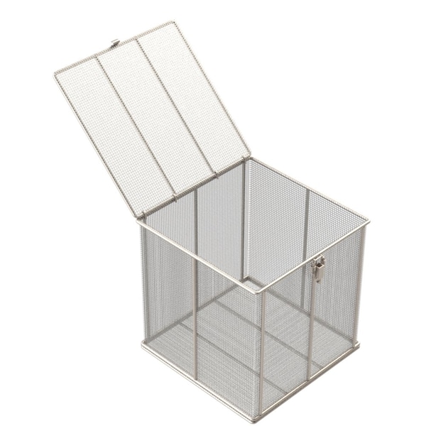 Rectangular Medium Duty Basket: 12in. L x 12in. W x 12in. H approx. outside dimensions of mesh lined area. Perfect for Parts Washing, Ultrasonic Cleaning, Vapor Degreasing, Sifting, Straining, and Material Handling. Strong 1/4in. Dia. Rod Frame with all joints TIG welded for strength, Hinged Lid with Compression Latch, No Handles. Lined with 4 Mesh x 0.063in. Woven Wire 4 wires per inch, 0.187in. Openings, 56% Open Area. Mesh fully resistance welded into the frame and ground smooth, . 304 Stainless Steel, Clean Natural Finish. Approximate Load Capacity: 65 lbs.. Estimated Basket Weight: 10.8 lbs.