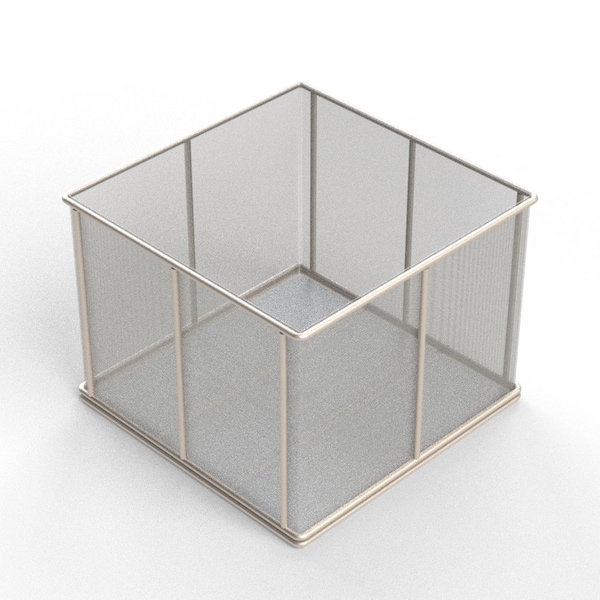 Rectangular Stainless Steel Wire Mesh Basket. For Ultrasonic Cleaning, Degreasing, Dipping and Cleaning Parts. 12L x 12W x 9H approx. outside dimensions excluding handles. 1/4 Dia. Rod Frame with all joints TIG welded for strength. No Handles, No Lid. Lined with 30 Mesh x .012 Woven Wire .021 Openings, 40% Open Area fully resistance welded into the frame and ground smooth. 304 Stainless Steel, Natural Finish. Reference Part #TMT-120120090-N30S . Est. wgt: 4.1 lbs. Capacity: 45 lbs.