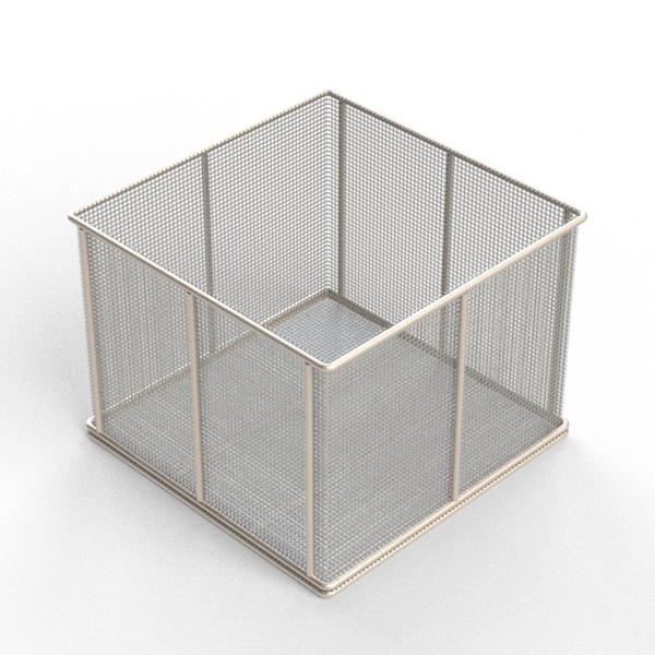 Rectangular Stainless Steel Wire Mesh Basket. For Ultrasonic Cleaning, Degreasing, Dipping and Cleaning Parts. 12L x 12W x 9H approx. outside dimensions excluding handles. 1/4 Dia. Rod Frame with all joints TIG welded for strength. No Handles, No Lid. Lined with 4 Mesh x .063 Woven Wire .187 Openings, 56% Open Area fully resistance welded into the frame and ground smooth. 304 Stainless Steel, Natural Finish. Reference Part #TMT-120120090-N04S . Est. wgt: 7.4 lbs. Capacity: 45 lbs.