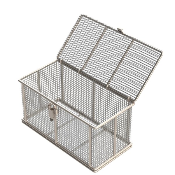 Rectangular Stainless Steel Wire Mesh Basket. For Ultrasonic Cleaning, Degreasing, Dipping and Cleaning Parts. 12L x 6W x 6H approx. outside dimensions excluding handles. 1/4 Dia. Rod Frame with all joints TIG welded for strength. Hinged Lid with Compression Latch, No Handles. Lined with 2 Mesh x .063 Wire .437 Openings, 76% Open Area fully resistance welded into the frame and ground smooth. 304 Stainless Steel, Natural Finish. Reference Part #TMT-120060060-P02S . Est. wgt: 4.5 lbs. Capacity: 45 lbs. Hinged Lid with Latch.