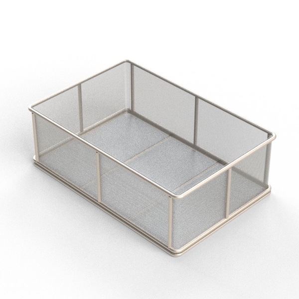 Rectangular Stainless Steel Wire Mesh Basket. For Ultrasonic Cleaning, Degreasing, Dipping and Cleaning Parts. 18L x 12W x 6H approx. outside dimensions excluding handles. 5/16 Dia. Rod Frame with all joints TIG welded for strength. No Handles, No Lid. Lined with 30 Mesh x .012 Woven Wire .021 Openings, 40% Open Area fully resistance welded into the frame and ground smooth. 304 Stainless Steel, Natural Finish. Reference Part #TMT-180120060-N30S . Est. wgt: 6.1 lbs. Capacity: 45 lbs.