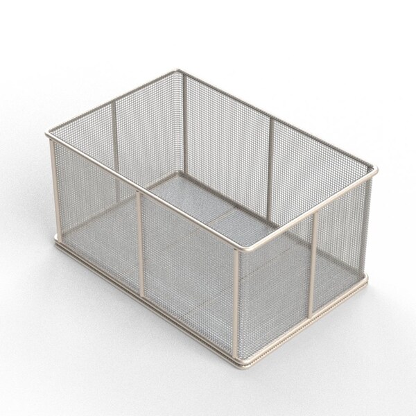 Rectangular Stainless Steel Wire Mesh Basket. For Ultrasonic Cleaning, Degreasing, Dipping and Cleaning Parts. 18L x 12W x 9H approx. outside dimensions excluding handles. 5/16 Dia. Rod Frame with all joints TIG welded for strength. No Handles, No Lid. Lined with 4 Mesh x .063 Woven Wire .187 Openings, 56% Open Area fully resistance welded into the frame and ground smooth. 304 Stainless Steel, Natural Finish. Reference Part #TMT-180120090-N04S . Est. wgt: 11.2 lbs. Capacity: 45 lbs.