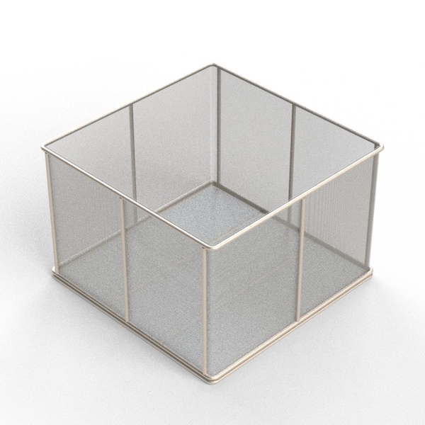 Rectangular Stainless Steel Wire Mesh Basket. For Ultrasonic Cleaning, Degreasing, Dipping and Cleaning Parts. 18L x 18W x 12H approx. outside dimensions excluding handles. 5/16 Dia. Rod Frame with all joints TIG welded for strength. No Handles, No Lid. Lined with 30 Mesh x .012 Woven Wire .021 Openings, 40% Open Area fully resistance welded into the frame and ground smooth. 304 Stainless Steel, Natural Finish. Reference Part #TMT-180180120-N30S . Est. wgt: 9.5 lbs. Capacity: 45 lbs.