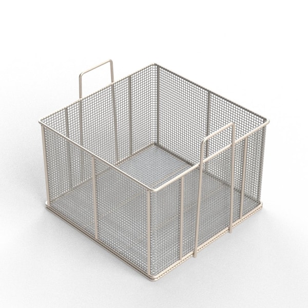 Rectangular Stainless Steel Wire Mesh Basket. For Ultrasonic Cleaning, Degreasing, Dipping and Cleaning Parts. 18L x 18W x 12H approx. outside dimensions excluding handles. 5/16 Dia. Rod Frame with all joints TIG welded for strength. Stacking Dual Grip Handles, 3 H x 5 W. Lined with 2 Mesh x .063 Wire .437 Openings, 76% Open Area fully resistance welded into the frame and ground smooth. 304 Stainless Steel, Natural Finish. Reference Part #TMT-180180120-A02S . Est. wgt: 14 lbs. Capacity: 45 lbs.