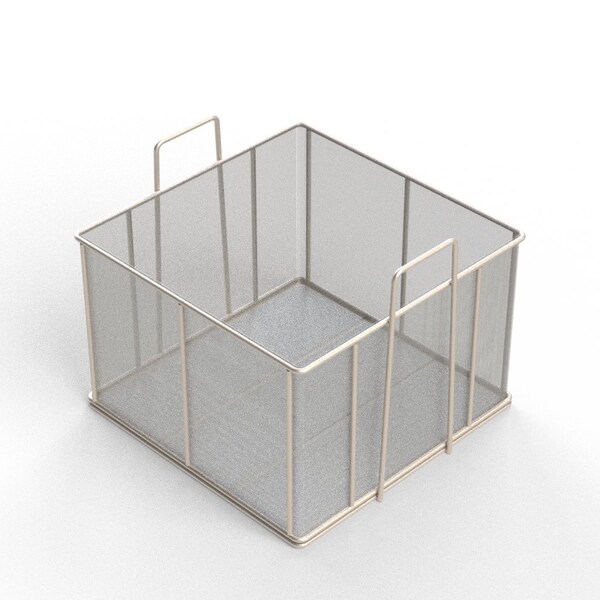 Rectangular Stainless Steel Wire Mesh Basket. For Ultrasonic Cleaning, Degreasing, Dipping and Cleaning Parts. 18L x 18W x 12H approx. outside dimensions excluding handles. 5/16 Dia. Rod Frame with all joints TIG welded for strength. Stacking Dual Grip Handles, 3 H x 5 W. Lined with 8 Mesh x .047 Woven Wire .078 Openings, 39% Open Area fully resistance welded into the frame and ground smooth. 304 Stainless Steel, Natural Finish. Reference Part #TMT-180180120-A08S . Est. wgt: 18.8 lbs. Capacity: 45 lbs.