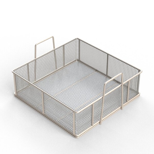 Rectangular Stainless Steel Wire Mesh Basket. For Ultrasonic Cleaning, Degreasing, Dipping and Cleaning Parts. 18L x 18W x 6H approx. outside dimensions excluding handles. 5/16 Dia. Rod Frame with all joints TIG welded for strength. Stacking Dual Grip Handles, 3 H x 5 W. Lined with 2 Mesh x .063 Wire .437 Openings, 76% Open Area fully resistance welded into the frame and ground smooth. 304 Stainless Steel, Natural Finish. Reference Part #TMT-180180060-A02S . Est. wgt: 10.6 lbs. Capacity: 45 lbs.