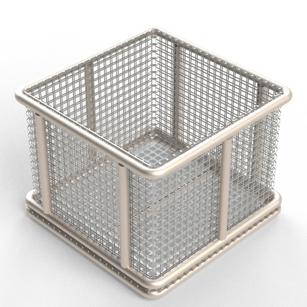 Rectangular Stainless Steel Wire Mesh Basket. For Ultrasonic Cleaning, Degreasing, Dipping and Cleaning Parts. 4L x 4W x 3H approx. outside dimensions excluding handles. 3/16 Dia. Rod Frame with all joints TIG welded for strength. No Handles, No Lid. Lined with 4 Mesh x .063 Woven Wire .187 Openings, 56% Open Area fully resistance welded into the frame and ground smooth. 304 Stainless Steel, Natural Finish. Reference Part #TMT-040040030-N04S . Est. wgt: 1 lbs. Capacity: 45 lbs.