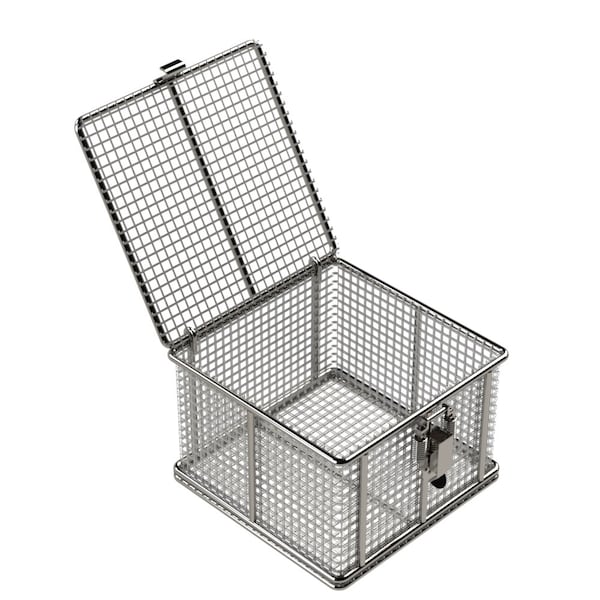 Rectangular Stainless Steel Wire Mesh Basket. For Ultrasonic Cleaning, Degreasing, Dipping and Cleaning Parts. 6L x 6W x 4H approx. outside dimensions excluding handles. 3/16 Dia. Rod Frame with all joints TIG welded for strength. Hinged Lid with Compression Latch, No Handles. Lined with 2 Mesh x .063 Wire .437 Openings, 76% Open Area fully resistance welded into the frame and ground smooth. 304 Stainless Steel, Natural Finish. Reference Part #TMT-060060040-P02S . Est. wgt: 1.9 lbs. Capacity: 45 lbs. Hinged Lid with Latch.