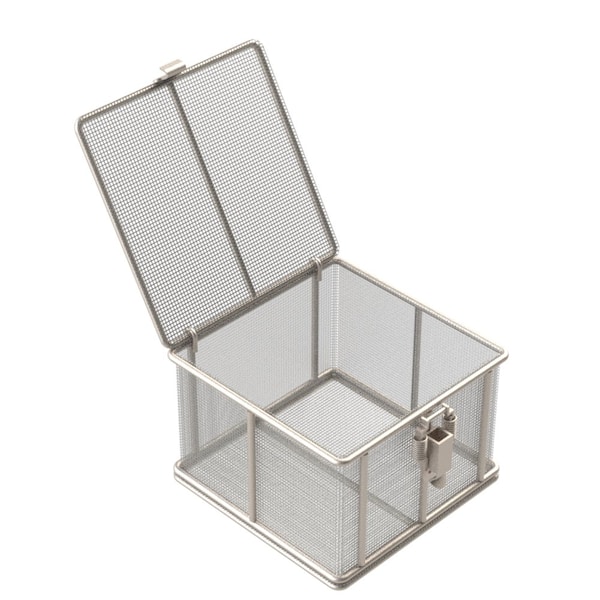 Rectangular Stainless Steel Wire Mesh Basket. For Ultrasonic Cleaning, Degreasing, Dipping and Cleaning Parts. 6L x 6W x 4H approx. outside dimensions excluding handles. 3/16 Dia. Rod Frame with all joints TIG welded for strength. Hinged Lid with Compression Latch, No Handles. Lined with 8 Mesh x .047 Woven Wire .078 Openings, 39% Open Area fully resistance welded into the frame and ground smooth. 304 Stainless Steel, Natural Finish. Reference Part #TMT-060060040-P08S . Est. wgt: 2.5 lbs. Capacity: 45 lbs. Hinged Lid with Latch.