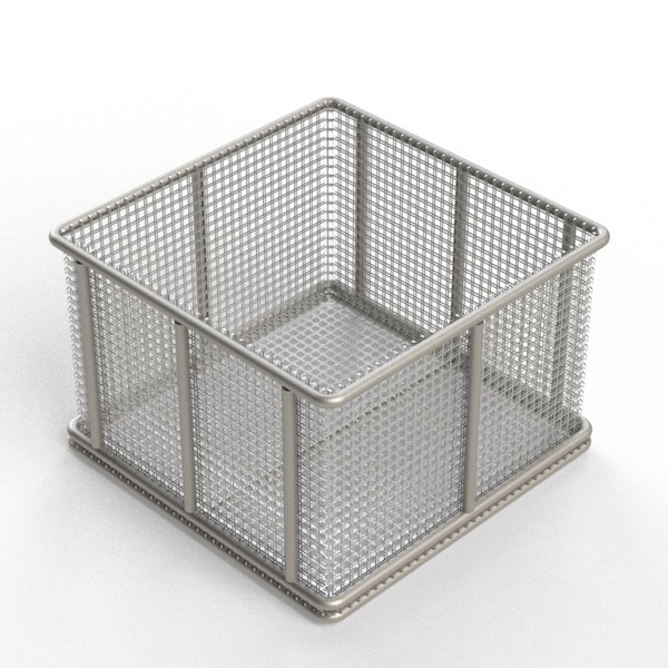Rectangular Stainless Steel Wire Mesh Basket. For Ultrasonic Cleaning, Degreasing, Dipping and Cleaning Parts. 6L x 6W x 4H approx. outside dimensions excluding handles. 3/16 Dia. Rod Frame with all joints TIG welded for strength. No Handles, No Lid. Lined with 4 Mesh x .063 Woven Wire .187 Openings, 56% Open Area fully resistance welded into the frame and ground smooth. 304 Stainless Steel, Natural Finish. Reference Part #TMT-060060040-N04S . Est. wgt: 1.8 lbs. Capacity: 45 lbs.