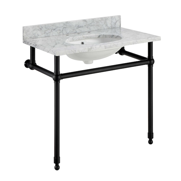 Looking to take your bathroom in a bold new direction? This wall-mounted masterpiece of modern decor features a scratch-resistant Carrara White stone counter top with a White ceramic sink as its focal point, supported by a charmingly old-fashioned stainless steel frame that’s finished in Matte Black. This one of a kind console sink setup will become the centerpiece of any bathroom.. Includes counter top sink, frame and mounting hardware. Scratch-resistant Carrara White stone counter top features built-in backsplash. Rust-resistant stainless steel frame is finished in dramatic Matte Black. Console dimensions: 34.5 in. W x 34 in. H x 22 in. D. Counter top dimensions: 36 in. W x 8 in. H x 22 in. D. Sink dimensions: 18.1 in. W x 12.9 in. D. Get it fast — ships from warehouse within 24 hours of order processing. Safe and convenient curbside delivery. Water supply kit and drain not included. LED Mirror shown is BA-LMDFV002WH, 30 in. H x 24 in. W LED Mirror with easy touch dimmer and defogger, sold separately. Also available in Rose Gold, model number CS-FGC004-RG, Brushed Nickel, model number CS-FGC004-BN, and Brushed Gold, model number CS-FGC004-BG