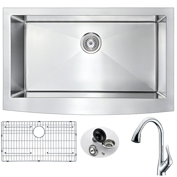 ANZZI presents the 32 in. ELYSIAN SERIES hand crafted farmhouse kitchen sink. Representing the latest in modern home fixture designs and traditional European crafting technique this stunning display of artistry is hand shaped to perfection using RHINO ALLOY certified 16-Gauge 304 stainless steel. Only ANZZI hand crafted farmhouse kitchen sinks utilize RHINO ALLOY certified materials for superior strength and quality. The cavernous deep soaking basin will comfortably accommodate the largest dish loads including pots, pans and more. And every ANZZI sink features extra-large Echo-STOP sound dampening pads and a layer of protective composite coating to further quiet noise and prevent condensation. Each ANZZI faucet has been certified as Water Sense approved with solid brass construction and valve included. Well defined diversion lines ensure quick and total water drainage and the subtly curved corners allow of easier cleaning. ANZZI carries a proud tradition of crafting long lasting, quality home fixtures. With ANZZI perfection is our tradition.Single deep soak basin openingANZZI Accent kitchen sink faucet KF-AZ031 ANZZI Echo-STOP sound absorbing technology drastically reduces noise Triple coated underside shielding prevents condensation Dimensions: 32.875 in. L x 20.75 in. W x 10 in. H (Basin Depth: 10 in.) Minimum Cabinet Space: 33 in. Standard 3.5 in. drain opening Laser precise diverting lines allow for more efficient water drainage Quality assured handmade construction RHINO ALLOY certified 304 Stainless Steel with 16 gauge strength cUPC certified Lustrous Satin finish Includes perfect fitting strainer and drain assembly, insert strainer basket, mounting hardware Ships from factory within 24 hours once order is processed