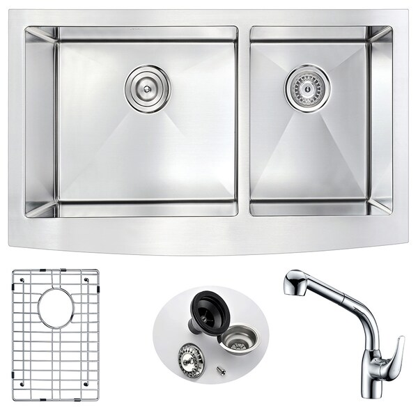 ANZZI presents the 36 in. ELYSIAN SERIES hand crafted farmhouse kitchen sink. Representing the latest in modern home fixture designs and traditional European crafting technique this stunning display of artistry is hand shaped to perfection using RHINO ALLOY certified 18-Gauge 304 stainless steel. Only ANZZI hand crafted farmhouse kitchen sinks utilize RHINO ALLOY certified materials for superior strength and quality. The cavernous 60/40 deep soaking dual basin will comfortably accommodate the largest dish loads including pots, pans and more. And every ANZZI sink features extra-large Echo-STOP sound dampening pads and a layer of protective composite coating to further quiet noise and prevent condensation. We have paired this sink with the ANZZI Braid Kitchen Sink Faucet. Each ANZZI faucet has been certified as Water Sense approved with solid brass construction and valve included. Well defined diversion lines ensure quick and total water drainage and the subtly curved corners allow of easier cleaning. ANZZI carries a proud tradition of crafting long lasting, quality home fixtures. With ANZZI perfection is our tradition.Dual deep soak basin opening with 60/40 splitANZZI Braid kitchen sink faucet KF-AZ040 ANZZI Echo-STOP sound absorbing technology drastically reduces noise Triple coated underside shielding prevents condensation Dimensions: 35.875 in. L x 20.75 in. W x 10 in. H (Basin Depth: 10 in.) Minimum Cabinet Space: 36 in. Standard 3.5 in. drain opening Laser precise diverting lines allow for more efficient water drainage Quality assured handmade construction RHINO ALLOY certified 304 Stainless Steel with 18 gauge strength cUPC certified Lustrous Satin finish Includes perfect fitting strainer and drain assembly, insert strainer basket, mounting hardware Ships from factory within 24 hours once order is processed