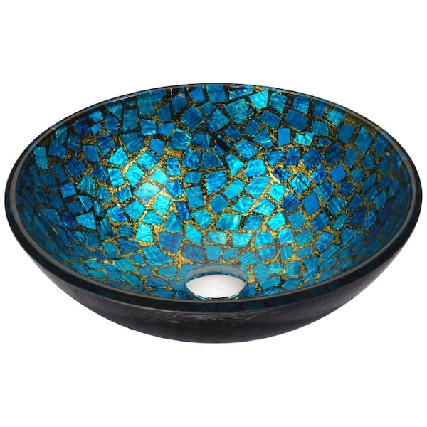 The ANZZI Mosaic Series sink is a traditionally crafted round vessel sink adorned in a Blue/Gold Mosaic finish. Each ANZZI vessel sink is formed using RHINO ALLOY certified high tempered Deco-Glass material. The result is an elegantly shaped and captivating vessel centerpiece for any bathroom counter.RHINO ALLOY certified tempered deco-glass construction in a stunning Blue/Gold Mosaic finishScratch-tough and stain-resistant non-porous surface Easy-to-clean low maintenance Top mount installation Dimensions: 16.5 in. L x 16.5 in. W x 5.7 in. H Deco-glass thickness: 1/2 in. Single 1.75 in. standard drain opening ANZZI Polished Chrome pop-up drain included Ships from factory within 24 hours once order is processed Limited To speak to a knowledgeable and dedicated ANZZI specialist simply call 1-844-44-ANZZI or visit us on the web at www.ANZZI.com