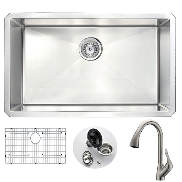 ANZZI presents the 30 in. VANGUARD SERIES hand crafted under mount kitchen sink. Representing the latest in modern home fixture designs and traditional European crafting technique this stunning display of artistry is hand shaped to perfection using RHINO ALLOY certified 18-Gauge 304 stainless steel. Only ANZZI hand crafted kitchen sinks utilize RHINO ALLOY certified materials for superior strength and quality. The cavernous deep soaking basin will comfortably accommodate the largest dish loads including pots, pans and more. And every ANZZI sink features extra-large Echo-STOP sound dampening pads and a layer of protective composite coating to further quiet noise and prevent condensation. We have paired this sink with the ANZZI Accent Kitchen Sink Faucet. Each ANZZI faucet has been certified as Water Sense approved with solid brass construction and valve included. Well defined diversion lines ensure quick and total water drainage and the subtly curved corners allow of easier cleaning. ANZZI carries a proud tradition of crafting long lasting, quality home fixtures. With ANZZI perfection is our tradition.Single deep soak basin openingANZZI Accent kitchen sink faucet KF-AZ031BN ANZZI Echo-STOP sound absorbing technology drastically reduces noise Triple coated underside shielding prevents condensation Dimensions: 30 in. L x 18 in. W x 10 in. H (Basin Depth: 10 in.) Minimum Cabinet Space: 33 in. Standard 3.5 in. drain opening Laser precise diverting lines allow for more efficient water drainage Quality assured handmade construction RHINO ALLOY certified 304 Stainless Steel with 18 gauge strength cUPC certified Lustrous Satin finish Includes perfect fitting strainer and drain assembly, insert strainer basket, mounting hardware Ships from factory within 24 hours once order is processed