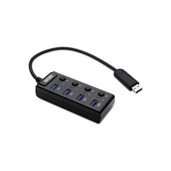 Dyconn hub4b-p portable 4-port usb 3.0 hub the dyconn portable 4 port usb 3.0 hub is designed for portability and enables the connection of 4 usb supported devices through one usb 3.0 connection, expanding one usb 3.0 port into four. It's small, lightweight design and integrated usb 3.0 cable makes the dyconn portable 4 port usb 3.0 hub perfect for users on the go. With one usb 3.0 connection, connection possibilities, such as printers, external hard drives, keyboards and mice. On and off buttons are provided to maximize power distribution to connected devices. The dyconn portable 4 port usb 3.0 hub supports plug and play functionality, requiring no external power adapter, and is backward compatible with usb 2.0/1.1 products.