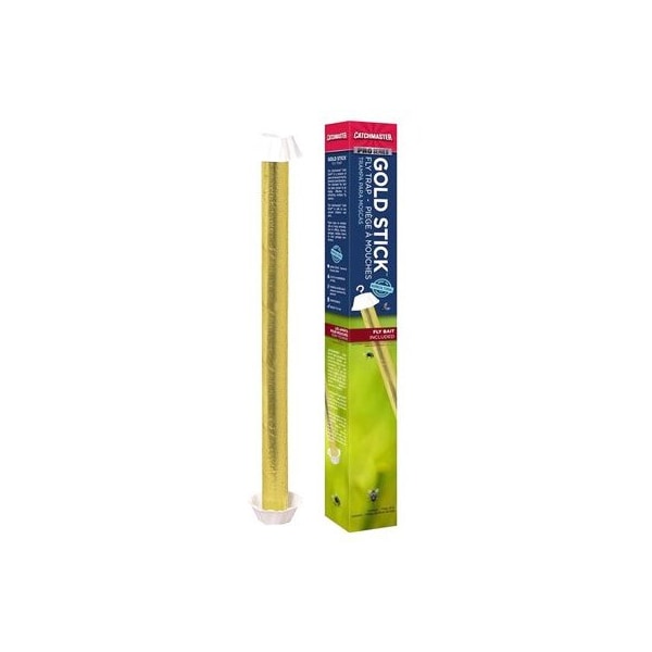 Catchmaster 24 Gold Stick fly trap. Use in homes garages offices kitchens laboratories stables barns and inside garbage cans or containers. Designed to attract multiple fly species. Place traps on window sills or hang them in areas of high fly activity. Hook included for hanging. Will remain effective for months. Indoor and outdoor use ready to use disposable and non-toxic.