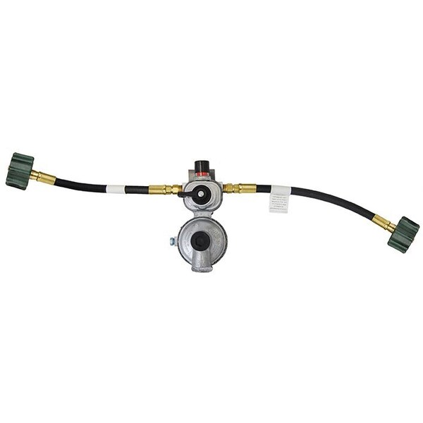 1/4 Inch Female Inverted Flare X 3/8 Inch FPT; Two Stage; 225000 BTU I Stage/ 150000 BTU II Stage; With Two 15 Inch Propane Hoses; Unfinished Zinc; Die Cast Zinc; Internal Relief Spring Loaded Diaphragm Type; Approved For RV Use; Retail Packaged; Vertical Mount