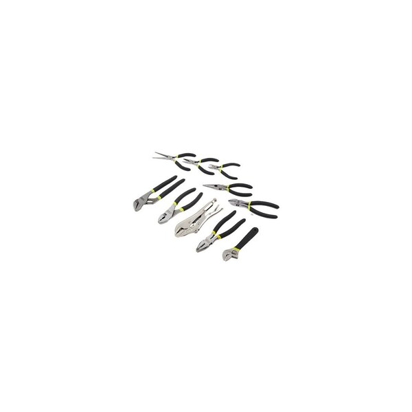 Master Mechanic, 10 Piece, Pliers & Wrench Set, Includes 1 Each: 8in Tongue & Groove Pliers With Smooth Rivet Design, 6in Slip Joint Pliers With Smooth Rivet Design, 6in Long Nose Pliers , 6in Diagonal Nose Pliers, 7in Linesman Pliers, 4-1/2in Diagonal Pliers, 4-1/2in Long Nose Pliers, 5-3/4in Needle Nose Pliers, Machine Finish For Pliers, 6in Adjustable Wrench, 7in Straight Jaw Locking Pliers, Nickel Plated Finish, Made Of Heat Treated Forged Steel, Induction Hardened Teeth Meet Or Exceed All ANSI Standards, Double Dipped Handles, Carbon Steel Body.