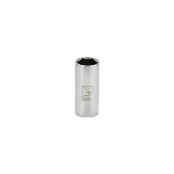 Master Mechanic, 3/8in Drive, 11/16in, 6 Point, Deep Well Socket, Chrome Vanadium Steel, Surface Drive, Design Contacts The Flat Surfaces On Fastener Instead Of Corners, Reduces Slippage, Reduces Rounding Of Fastener & Will Still Grab On Slightly Rounded Fasteners.