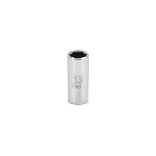 Master Mechanic, 3/8in Drive 13 mm, 6 Point, Deep Well Socket, Chrome Vanadium Steel, Surface Drive Design Contacts The Flat Surfaces On Fastener Instead Of Corners, Reduces Slippage, Reduces Rounding Of Fastener & Will Still Grab On Slightly Rounded Fasteners.