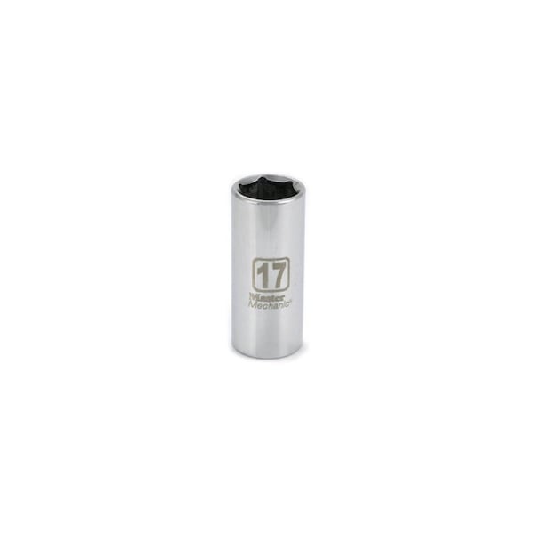 Master Mechanic, 3/8in Drive 17 mm, 6 Point, Deep Well Socket, Chrome Vanadium Steel, Surface Drive Design Contacts The Flat Surfaces On Fastener Instead Of Corners, Reduces Slippage, Reduces Rounding Of Fastener & Will Still Grab On Slightly Rounded Fasteners.