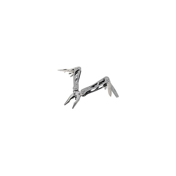 Master Mechanic, 12-N-1, Big Size, Folding, Multi Tool, Bead Blast Stainless Steel Handle, Includes: Long Nose Pliers, Standard Pliers, Wire Cutter, Serrated Blade, Can Opener, Phillips Screwdriver, Awl, Bottle Opener, File, Knife, Medium Slotted Screwdriver & Small Slotted Screwdriver.