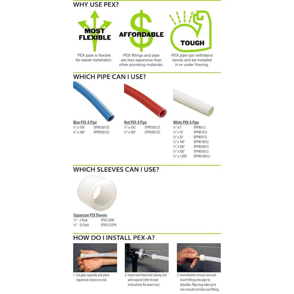The Apollo ExpansionPEX is simple to install and provides flow control through an anti-stick and smooth operating quarter turn tee-style handle. Apollo ExpansionPEX barb fittings are a key component to one of the most economical potable water piping systems. Also capable of integration into hydronic heating systems, Apollo ExpansionPEX valves must be secured into place Apollo ExpansionPEX sleeves or comparable expansion-type sleeve or ring (all sold separately). The Apollo ExpansionPEX system is a comprehensive piping system comprised of lead free brass fittings, poly alloy fittings, manifolds, valves, fasteners, tools and tubing designed for implementation in water delivery systems, simple or complex. A cold-expansion tool (sold separately) is required for installation.