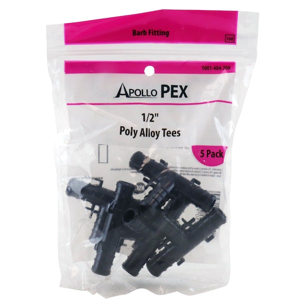 The ApolloPEX 1/2 in. Plastic PEX Barb Tee (5-Pack) is simple to install. ApolloPEX poly alloy fittings are the perfect alternative to brass in regions where water quality can negative affect brass. ApolloPEX barb fittings are a key component of the most economical potable water piping systems. Also capable of integration into hydronic heating systems, ApolloPEX tees can be secured into place using copper crimps, stainless steel pinch clamps or stainless steel crimp sleeves (all sold separately). The ApolloPEX system is a comprehensive piping system comprised of brass fittings, poly alloy fittings, manifolds, valves, fasteners, tools and tubing designed for implementation in water delivery systems, simple or complex.
