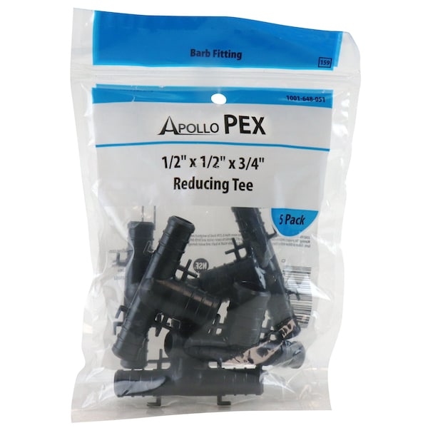 The ApolloPEX 1/2 in. x 1/2 in. x 3/4 in. Plastic PEX Barb Reducing Tee (5-Pack) is simple to install. ApolloPEX poly alloy fittings are the perfect alternative to brass in regions where water quality can negative affect brass. ApolloPEX barb fittings are a key component of the most economical potable water piping systems. Also capable of integration into hydronic heating systems, ApolloPEX tees can be secured into place using copper crimps, stainless steel pinch clamps or stainless steel crimp sleeves (all sold separately). The ApolloPEX system is a comprehensive piping system comprised of brass fittings, poly alloy fittings, manifolds, valves, fasteners, tools and tubing designed for implementation in water delivery systems, simple or complex.
