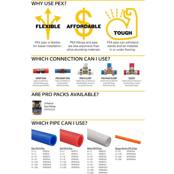 The ApolloPEX is simple to install. ApolloPEX barb fittings are a key component of the most economical potable water piping systems. Also capable of integration into hydronic heating systems, ApolloPEX adapters can be secured into place using copper crimps, stainless steel pinch clamps or stainless steel crimp sleeves (all sold separately). The ApolloPEX system is a comprehensive piping system comprised of brass fittings, poly alloy fittings, manifolds, valves, fasteners, tools and tubing designed for implementation in water delivery systems, simple or complex.