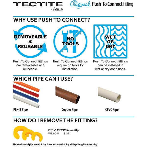 The 3/4 in. Tectite by Apollo Push-to-Connect IPS (Iron Pipe Size) x CTS (Copper Tube Size) conversion coupling is the fastest, cleanest and simplest way to transition from SCH40/80/120 pipe to any combination of copper, CPVC, PE-RT and PEX pipe without the use of tools, solder, open flame or glue. Simply insert the pipe to allow the high-strength stainless steel teeth to grip the pipe securely against the specially designed O-ring. Fitting removal and reuse is just as simple using a simple demount clip (sold separately). After assembly, fittings may be rotated for simpler installation in tight spaces. All Tectite by Apollo fittings are approved for use in both potable water and hydronic heating piping systems.