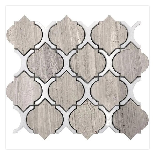 A perfect blend of natural tones, this polished tile pairs the cool, creamy brightness of Thassos White with the soft, earthy striations of Wooden Grey Marble Tile. The arabesque-inspired design features a balance of curves and geometric forms, creating a dynamic pattern that feels both bold and refined. Its neutral hues make it a favorite for versatile spaces while the intricate shapes add an undeniable touch of elegance.