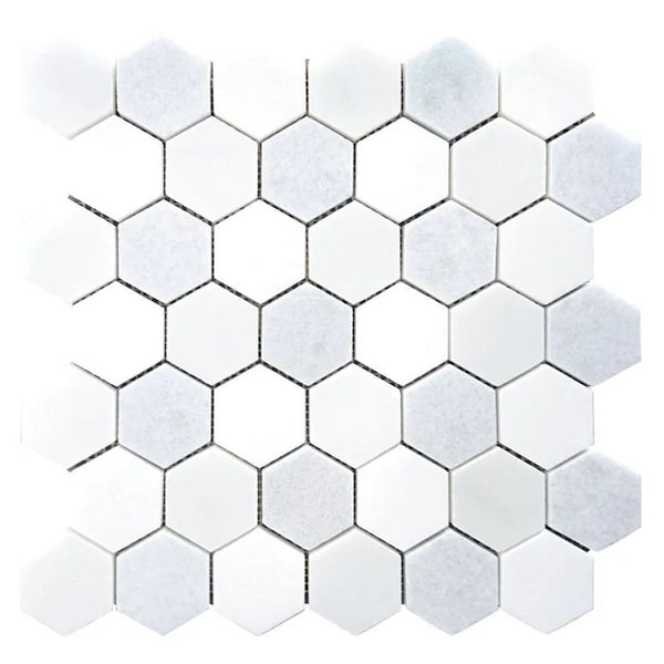 12x12 Thassos, Blue Celeste, Paper White Marble Hexagon Wall and Floor Tile 4.83 sqft/case, 5PK