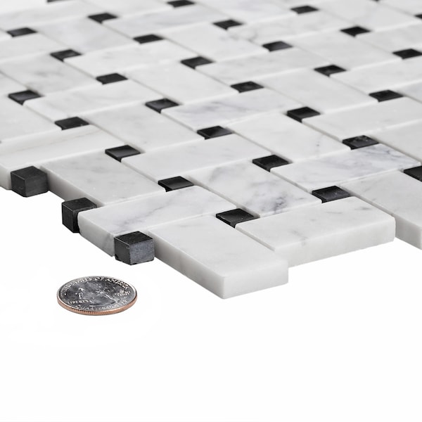 Sample, Carrara White Basket Weave W/Black Dots 12"X12" Mrbl Msic Tile